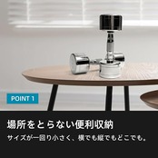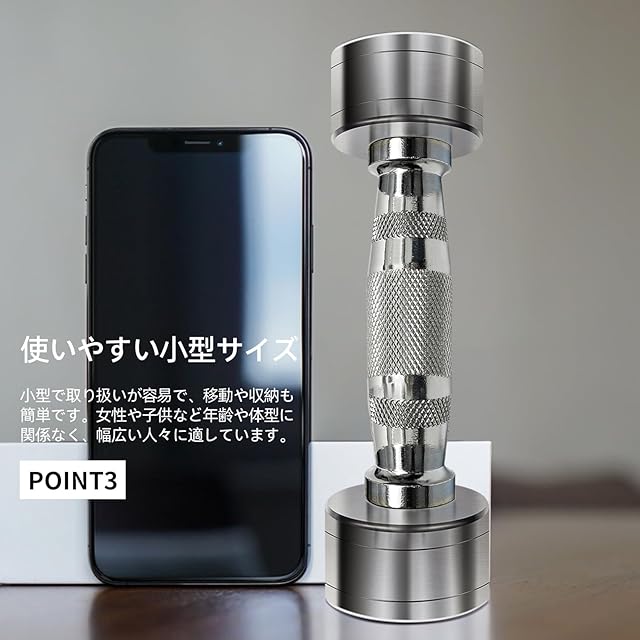 「場所をとらない簡単収納」従来のダンベルより一回り小さく、とくにプレートの部分が小さいたえめ、横置き、縦置きどちらも可能、収納が非常に便利。高品質のステンレスを採用、表面にビニールコーティングを施していないため、汗がかいても、同じ場所での長時間収納でも不快の臭いが全くしません。