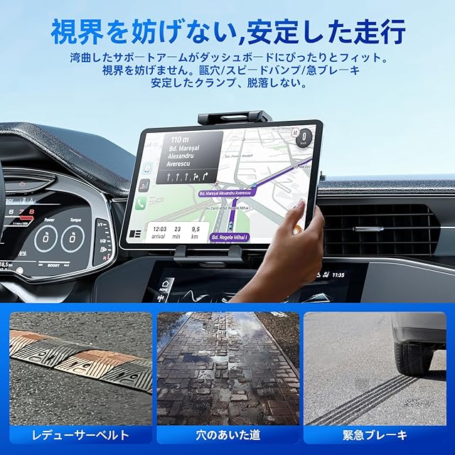 【大人気の最新改良型ipadタブレット車載ホルダー 】Elnicec 会社は「より早く、より安全な運転を体験しよう」という理念を持ちながら、心から認められる製品を作り出し続けています。お客様の意見を聞き、従来のダッシュボード車載ホルダーとは異なり、ウォーターフォール型の車載ホルダーはカーブしており、道路の遮るもののない運転ビューと、ipadの完璧な視野角度を提供します。快適で安全な視界を確保することが可能で、安心した運転をサポートします。悪路でも常にデバイスを安定させます。