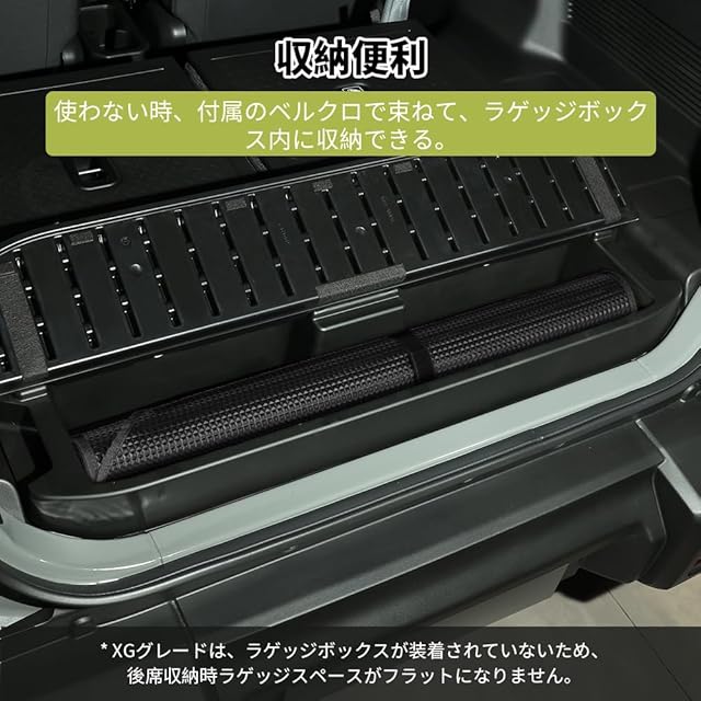 【適合車種・ジムニー専用】ジムニー[JB64W]18.07~(1型~)/5MT/4AT/4WD/XC/XL ;ジムニーシエラ[JB74W]18.07~(1型~)/5MT/4AT/4WD/JC/JL;車種専用設計なので、隙間がないようにぴったり装着できます。使わないときは付属のベルクロで束ねて、ラゲッジボックスに収納可能です。