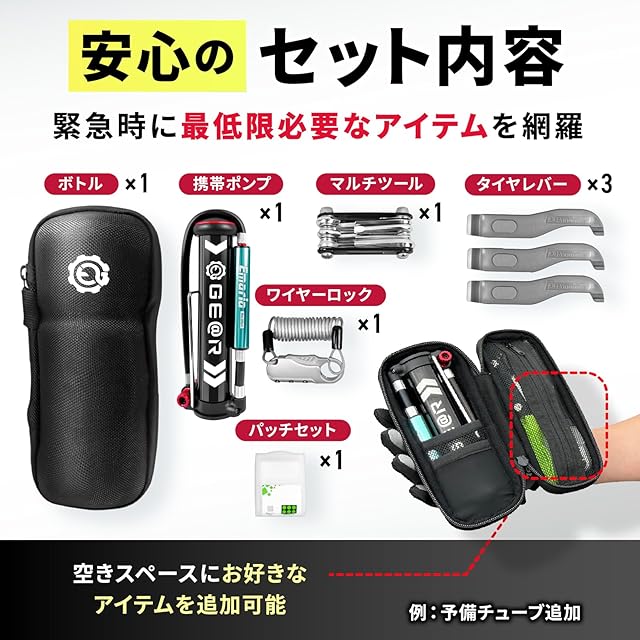 ✅【内容品】ツールケース本体、エマリア、マルチツール、タイヤレバー、パッチ、ワイヤーロックがセットになった緊急応急処置キットです。ロードバイクや自転車に最適なツールボックスとしてご利用いただけます。