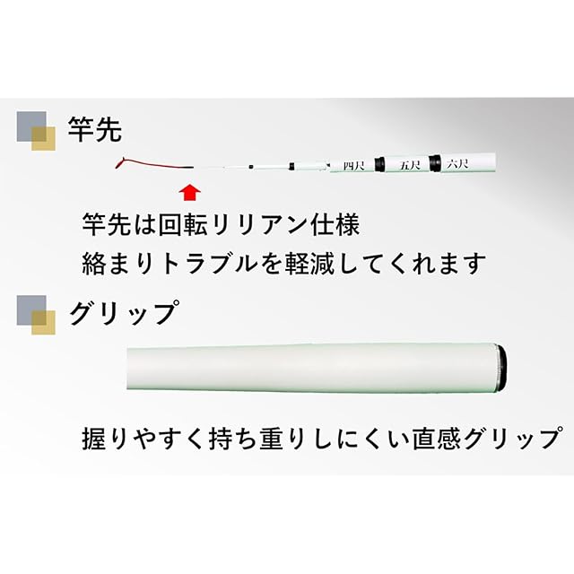搭載機能: 「竿先 赤色・回転リリアン搭載 (絡みトラブルを軽減)」「太めの直感グリップ (握りやすく・持ち重りしにくい)」「3段階ズーム機能 (ズーム部・尺数表記)」
