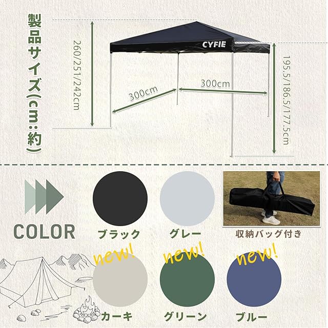 商品名:CYFIE タープテント 3mx3m ワンタッチ 大型 日除け 高耐水 3階段高さ調節 簡易設営 アウトドア キャンプ BBQ イベント 運動会 収納袋付き カーキ
