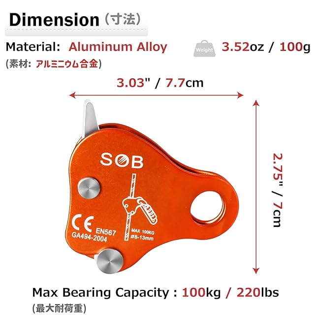 ✅【強度】最大支持力は100kgです。直径8 - 13mmのロープに適しています。サイドプレートはスライドできるのでロープの位置を問わず取り外し可能