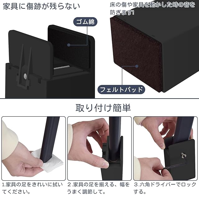 【取り付け簡単・家具保護】付属したアレンレンチを使えば、簡単に調整できます。家具やベッドフレームに直接クランプマウントできるように設計されているので、穴を開けて家具を傷つける必要はありません。弊社の家具継ぎ足しは優れた耐荷重によりしっかりと家具を支えて、家具に傷つけません。