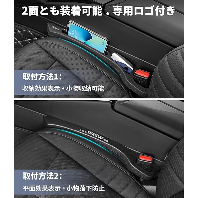 【両面取付可能・落下防止や小物収納】正面で取り付ければ、収納スペースがあるため、小物がシートの隙間に落ちるのを防ぐことができます。そして、スマホやキーなどの小物も保管できます。背面で取り付ければ、小物が落下防止することだけでなく、大きい専用ロゴをはっきりと見ることで、車内の雰囲気が高級感で溢れます!