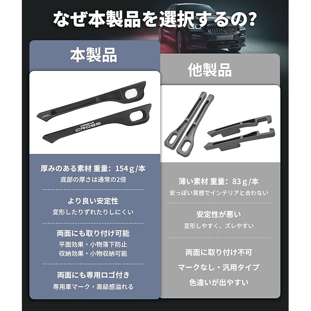 商品名:【カローラ クロス 専用】隙間クッション 厚型 COROLLA CROSS 専用ロゴ 隙間埋め 車用 シートサイド クッション カローラ クロス GX G Z グレード適用 正・裏面取付可シート コンソール 隙間収納 落下防止 小物入れ 内装パーツ 運転席+助手席 ロゴ左右対称設計 2本入り (ブラック, カローラ クロス専用)