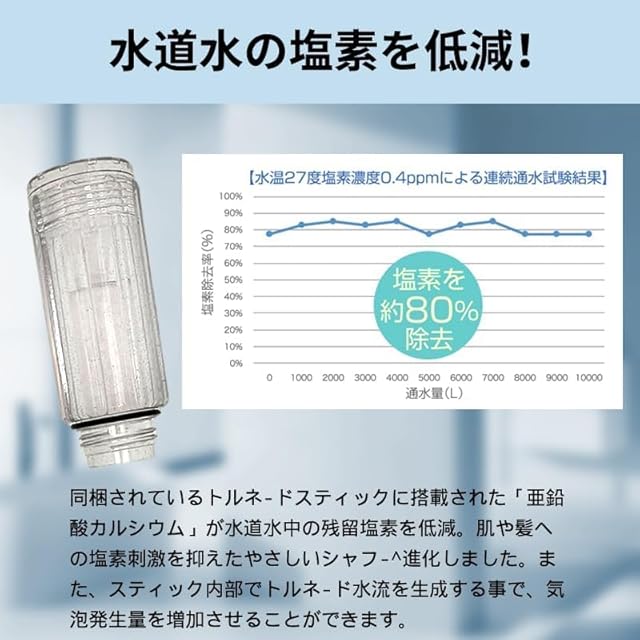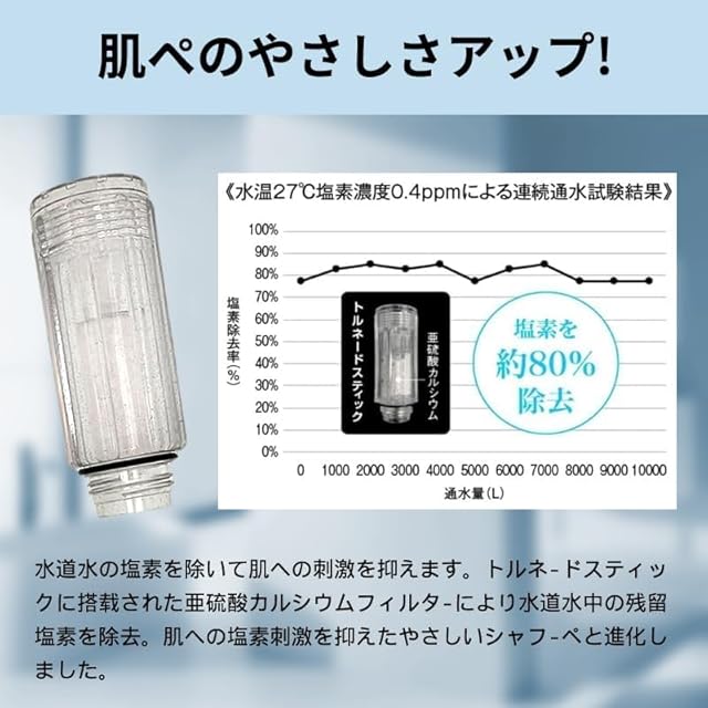 【塩素除去で敏感肌も安心】独自のフィルター技術により、水道水中の遊離残留塩素を効果的に除去。塩素による肌への刺激を最小限に抑え、乾燥やツッパリ感を防ぎます。毎日のシャワータイムを、肌にやさしくモイスチャー豊かな快適な体験に変えましょう。使用後は、滑らかでしっとりとした肌触りを実感でき、敏感肌の方でも心地よく入浴できます。