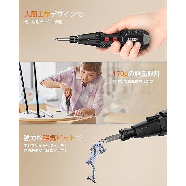 【軽量&人間工学デザイン】 わずか170gの超軽量ボディ!長時間使用しても疲れにくく、初心者でもラクに操作できます。ドリルビットは高硬度合金製で、耐久性抜群&折れにくい仕様。強力マグネットビットを採用しているため、ネジをしっかり固定でき、作業スピードが格段にアップします!