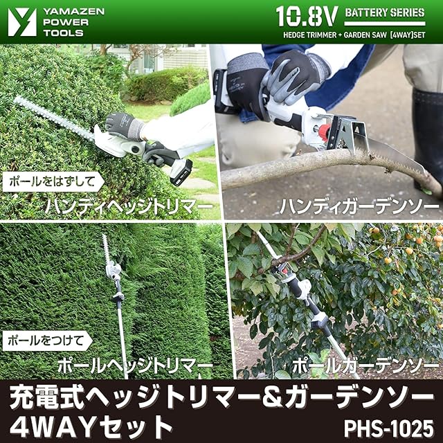 山善(YAMAZEN) 10.8V 充電式 高枝ガーデントリマー&ガーデンソーセット 伸縮式 コードレス 4WAY 高枝切りばさみ ヘッジトリマー 高枝チェーンソー 剪定 枝切 竹切 PHS-1025