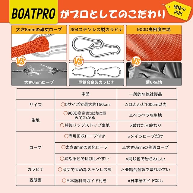 【プロ級の出航セット】アンカーロープと回収ロープは、直径8mmの二重編ナイロン制の、頑丈なロープを使用します;13*7.9cmの浮き玉はより大きく、シーアンカーがより見つかりやすいです;304ステンレス製のカラビナは錆対策はもちろん、海水の浸蝕にも強く、海に特化した頼りがいがある金具です。
