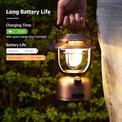 【おしゃれでレトロなLEDランタン・336時間長持ち】照らしすぎず落ち着いた雰囲気を味わえ、どこか懐かしい気持ちにさせてくれるレトロ調のおしゃれなLEDランタンです。シンプルでクラシックなデザインは、洋風や和風の場所を問わず様々な雰囲気に溶け込みます。15000mAh超大容量バッテリーを搭載しており、実用点灯時間は18~336時間に達します。キャンプライト、テーブルライトやナイトライトなどお好みに合わせて雰囲気作りの照明としてはもちろん、防災用にも最適です。