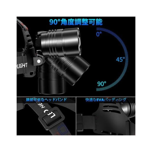 商品名:LED ヘッドライト XHP70 高輝度 充電式 防水 ヘッドランプ 三つ点灯モード ヘルメット ライト ズーム可能 90度調整 3つの18650バッテリー 釣り用 防災 自転車用 緊急停電 作業用 【新しいバージョン 】