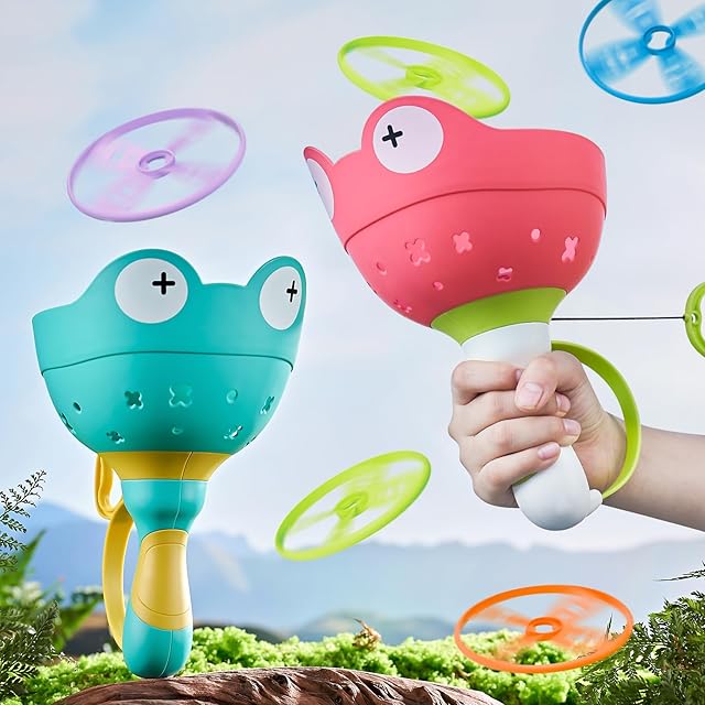 【遊び方簡単】パッケージ内容:カエルフライングランチャー x 2、フライングディスク x 16。電池不要で簡単に遊べます。子供たちはランチャーのタブを引くだけで、フロッグランチャーのヘッドがフリスビーを発射します。子供たちはランチャーでフリスビーをキャッチするだけです。