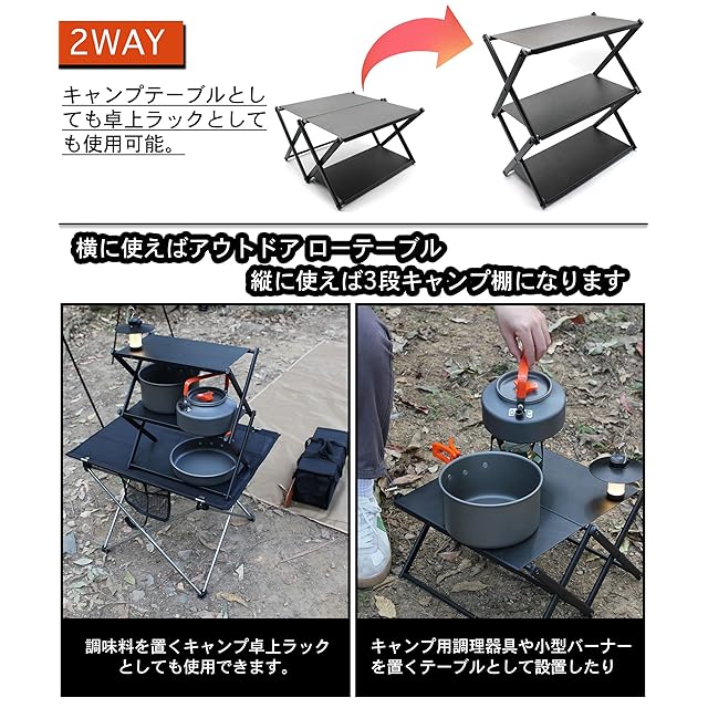 【2way】キャンプテーブルとしてもキャンプ棚としても使用可能。横に使えばアウトドア ローテーブル、縦に使えば二段キャンプ棚になります。使用シナリオやニーズに応じて、キャンプ用調理器具や小型バーナーを置くテーブルとして設置したり、調味料を置くキャンプ卓上ラックとしても使用できます。