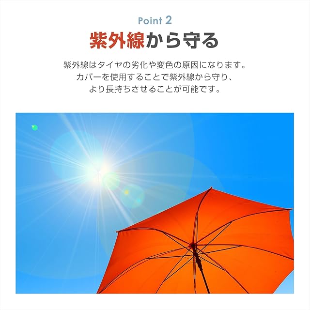 【防雨・防紫外線】シルバークロス加工を施した防水と防紫外線効果の高いタイヤカバー。防水防雨、防紫外線、防塵機能が備わっているので屋外でも長期間タイヤの劣化を防ぎます。