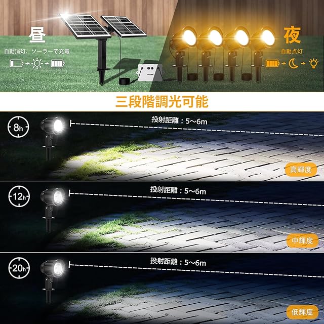 【分離型ソーラーライト、電気代なし!】ライト本体がソーラーパネルと別れているため、延長コードが総合14Mが有り、お庭の形と大きさによる自由に設置できます。パネルは陽当たりが良い場所に設置でき、充電時間が足りないのかを心配することがありません。それから、ライトを樹木の下、壁の北側、いろいろな日陰の所にライトを設置できます。ライトアップされた樹木と、壁面の樹木の影がとても綺麗で神秘的です。最新型の単結晶PETソーラーパネルを二つも採用し、エネルギー転換率は業界top水準に達します。直射日光を8時間ぐらい当てて、5000mAhバッテリーをフル充電します。8-20時間連続作動することをサッポーでき、AC電源が必要ない、電気代がかかりません。とても便利で省エネルギーです!