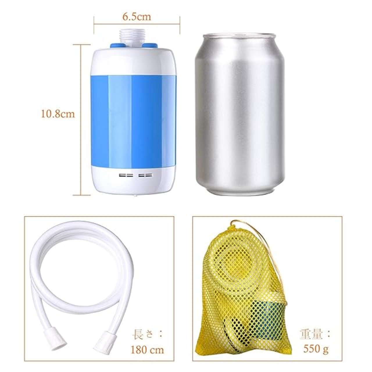 電気シャワー、アイアンハンマーによるバッテリー駆動の防水ハンドヘルドポータブルシャワー<br>、シャワーヘッド付き、水流ストール調整、大容量4800mAh <br>充電式バッテリー、安全保護ウォーターポンプ、屋内/屋外に適しています <br>シャワー、ペットの洗濯、車の洗濯、庭の水やり、旅行、キャンプ!<br> <br>シャワーを浴びる時間はどれくらいですか?<br> <br>フルパワーのとき、ポータブル電気シャワーは60分以上。ハイストールでは、50Lのバケツの水を使用すると、約12分以上の連続使用が可能になります。低いストールでは、50Lのバケツの水を使用して、<br> 16分以上使用できます。これは、髪を濡らし、洗い、<br>洗い流し、石鹸で洗い流し、体を洗い流すのに十分な時間と十分な水流です。<br> <br>このポータブル電気シャワーを充電するにはどうすればよいですか?<br> <br>ポータブル電気シャワーはDC5V入力で充電されます。充電時間は、<br>充電器の出力電流の大きさによって異なります。 5V / 2A充電器を使用する場合、<br>充電時間は約3時間です。ただし、5V / 1A充電器を使用する場合、充電時間は<br> 6時間以上になります。ローバッテリー<br>インジケーターライト(赤)、充電インジケーターライト(青)、USB-DCを備えたポータブル電気シャワーケーブルを使用すると、<br>携帯電話アダプター、<br>充電式宝物、コンピューター、車の充電器など、充電ツールのすべての5V出力を接続して充電できます。<br> <br>製品仕様: <br>電圧:3.7V <br>リチウム電池:2x 2400mAh <br>水流:ローストール3L /分;ハイストール4L /分<br>充電方法:DC入力5V <br>充電時間:お客様によって異なります充電器(5V / 2A:約3時間)<br>インジケーターライト:充電インジケーターライト(青);低電力インジケーターライト(赤)<br>全長:約210cm(82.7インチ)<br>ポンプサイズ:Φ65x 108 mm(Φ2.56x4.25インチ)<br>安全水温:5℃-50℃<br> <br>パッケージの内容:<br> 1xポータブル電気シャワー<br> 1xUSB-DCケーブル<br > 1xサクションキャップ<br> 1xユーザーマニュアル<br>