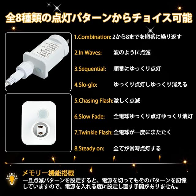 【全8種類の点灯パターンで暗い夜も華やかに】8つもある点灯パターンは、ボタンを押すだけで簡単に切り替えが可能です。波のようなゆったりとした点灯からだんだんと速くなるパターン、激しくリズミカルな点灯などさまざまなパターンを楽しめます。パーティやクリスマスなど、目的やシーンに合わせた演出ができます。