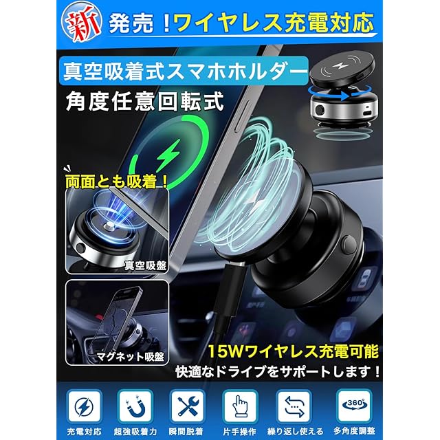 商品名:SEARISE スマホホルダー 真空吸着式 車 スマホスタンド 充電 車載スマホホルダー ワイヤレス充電 mag-safe対応 真空スマホホルダー 車 高級合金素材 スマホホルダー マグネット 多角度自由調節 マグセーフ 車載 携帯ホルダー 車 スマホ車載ホルダー 携帯スタンド iPhone&Android多機種対応(ブラック)