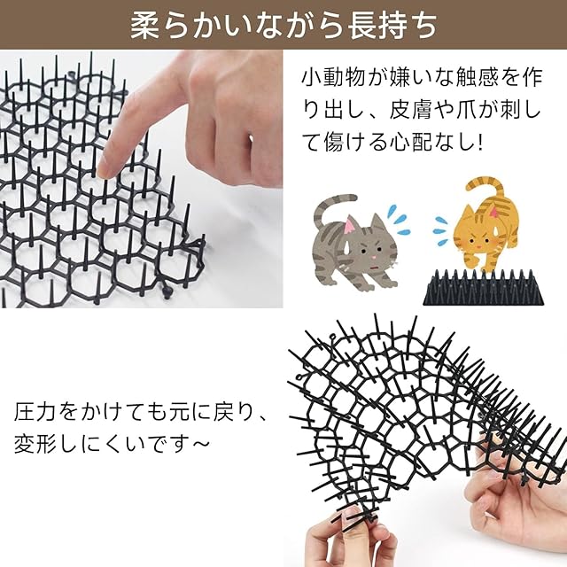 【傷けない▪猫よけ効果抜群】プラスチックの柔らかい尖ったことで小動物が嫌いな触感を作り出し、より効率的の小動物避け策になります。高品質プラスチックで滑らかなピンを作り、ペットの皮膚や爪が刺して傷ける心配がありません。