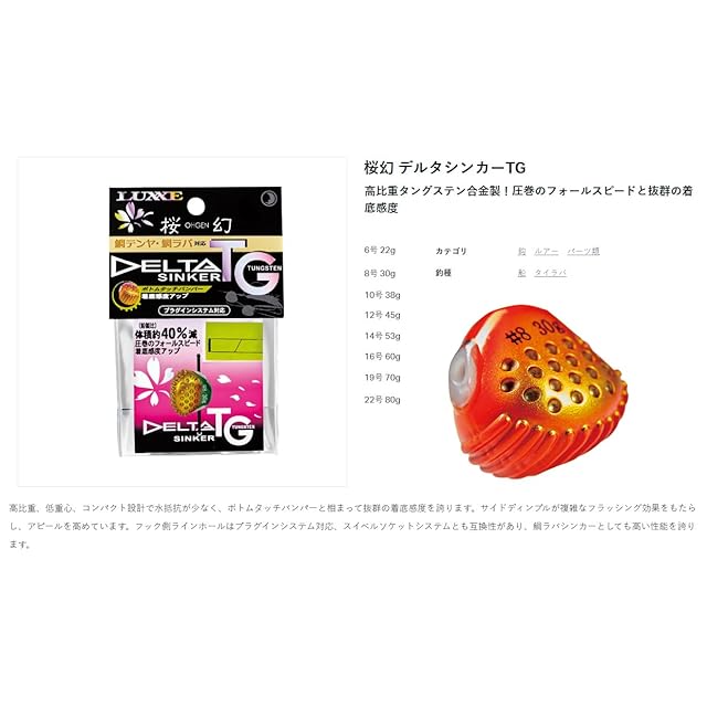 【品目コード: 19-401 / シリーズ名: 桜幻 デルタシンカーTG】……高比重タングステン合金製タイラバヘッド! 圧巻のフォールスピードと抜群の着底感度!! 固定式で誘い・遊動式で安心ファイト! 瞬時にフックをヘッドに固定できる画期的な「プラグインシステム対応」モデル。