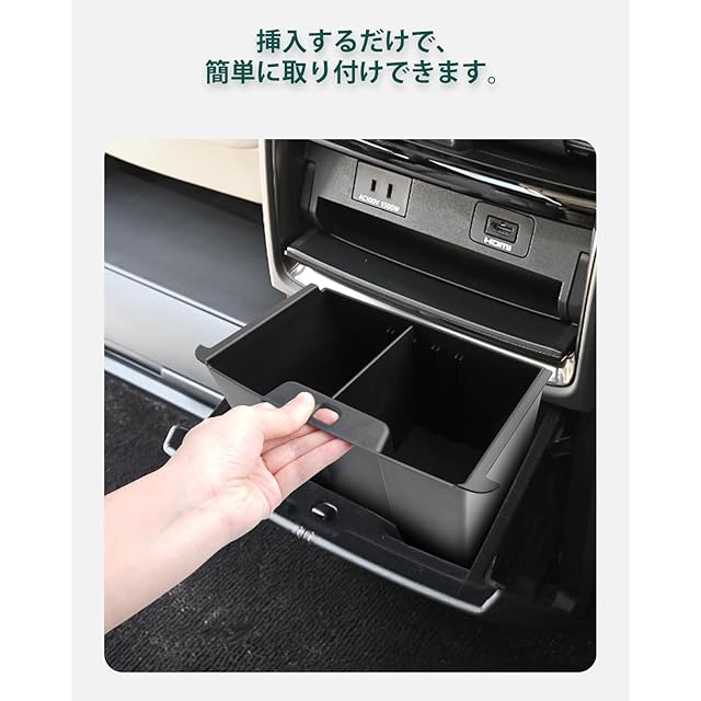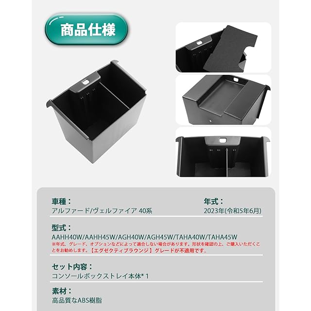 【対応車種】アルファード40系(令和5年6月) ヴェルファイア 40系(令和5年6月) Z グレード対応 ご注意:Executive Lounge グレードが不適用です。【パッケージ内容】:コンソールボックストレイ本体*1 【40系乗りには必需品】コンソールリヤエンドボックス内部に仕切りがないため、物を探しにくく、中身が乱れて、充電ケーブルが絡まることは非常に不便ですね。弊社のアルファード/ヴェルファイア 40系専用設計リアマルチボックスを装着するだけで、収納する小物のサイズに合わせて、付属のバリエーションで収納部を仕切ることができます。汚れたら取り外して洗えるので、ゴミ袋をセットしてゴミ箱としても使えます。 【専用設計なので設置簡単】ネジや3M両面テープ等が要らない取付!!コンソールリヤエンドボックスに載せるだけで、簡単装着!脱着も簡単です。 【優れた上質なABS樹脂を採用】ABS素材の採用により、剛性、硬度、耐衝撃性が優れたです。味がないし、環境に優しいし、耐久性も高いです。汚れたら水で洗われて、繰り返し使用できます。 【品質】弊社の製品は品質が付き、何にか不具合・不良があればご満足なサービスを提供致します。製品に何か不明点がありましたら、ご連絡頂ければ迅速に対応させて頂きますので、いつでもお気軽にメールでご連絡ください。弊社はお客様へご満足いただけるよう最後までサポートさせていただくよう心掛けております。