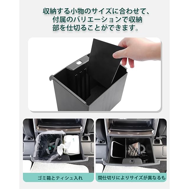 【40系乗りには必需品】コンソールリヤエンドボックス内部に仕切りがないため、物を探しにくく、中身が乱れて、充電ケーブルが絡まることは非常に不便ですね。弊社のアルファード/ヴェルファイア 40系専用設計リアマルチボックスを装着するだけで、収納する小物のサイズに合わせて、付属のバリエーションで収納部を仕切ることができます。汚れたら取り外して洗えるので、ゴミ袋をセットしてゴミ箱としても使えます。