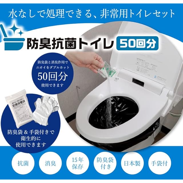 防臭抗菌トイレ50回セット 非常用トイレ 簡易トイレ 15年保存 消臭凝固剤 ポリ手袋付 水がなくても簡単処理 断水対策 携帯トイレ 日本製 1個 防災防犯ダイレクト