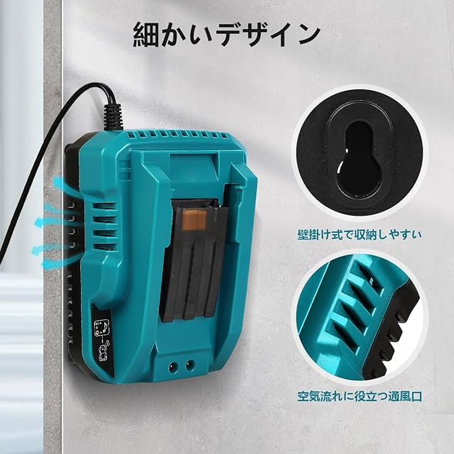 【安全の回路保護制御】弊社のマキタ互換充電器がPSEマークが取得済みです。中にデジタルチップが搭載され、バッテリーの状態(高温、満充電後の再充電、過放電等)を判断し自体状態が管理されます。また、電気回路保護が設置して充電安全を守り、使用寿命においても純正品に負けません。【壁掛け】壁と棚と板に充電器を掛けて収納しやすいです。雨ざらしや水濡れも防止できるのは安全です。