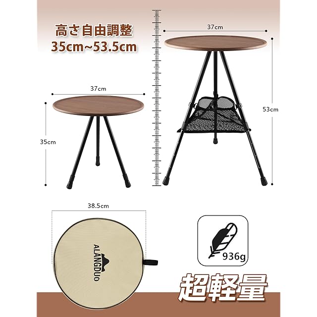 商品名:キャンプ テーブル 折り畳み アウトドア テーブル コンパクト ミニテーブル 折りたたみ ベランダ/ガーデン/屋内/屋外 サイドテーブル 高さ調整 釣り/登山/ソロキャンプ/バーベキュー/焚き火テーブル 収納バッグ付き 持ち運び (木目)