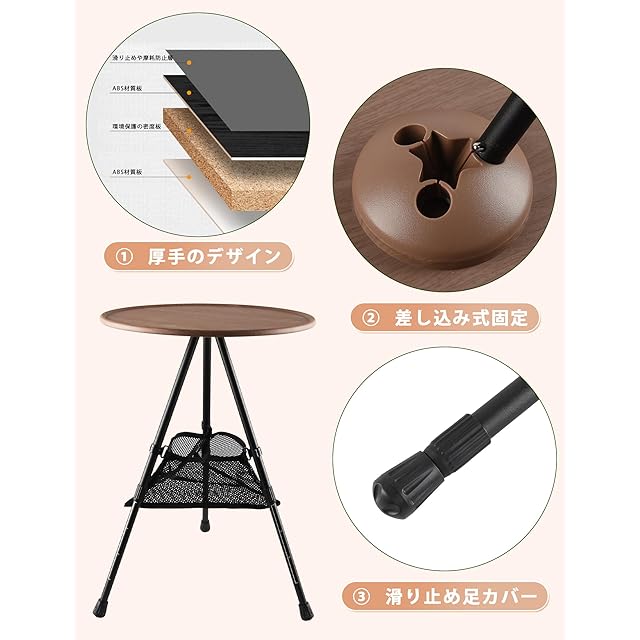 【安定性も抜群】アウトドアテーブルは三脚構造を採用し、重力構造に適合します。地面の角度に合わせて脚の長さを別々に調整できますので、斜面の地形でも安定的に使え、テーブルの揺れとか心配いりません。食べ物や飲み物はもちろん、クーラーボックスなどの重い物も載せられます。