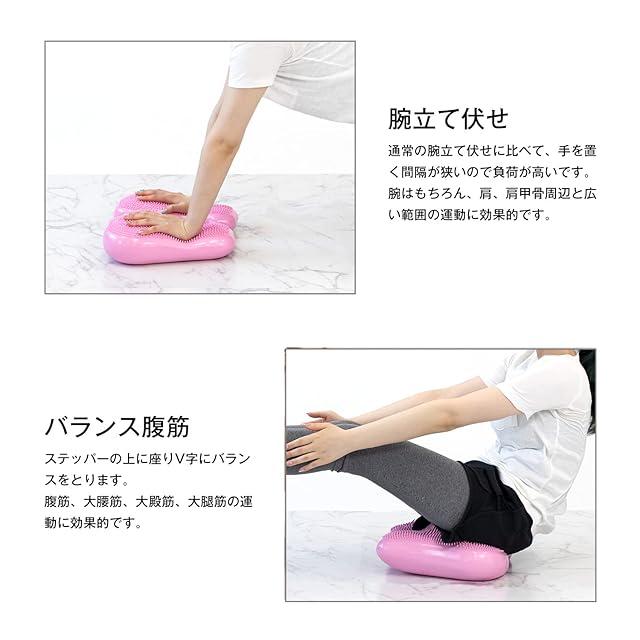 【様々なトレーニングが可能】ステッパーとしてだけではなく、腕立て伏せや、腹筋、スクワットなど様々な筋トレで使用することができます。空気で膨らませる仕様ですので、もちろん省スペース。ご自身のトレーニングに合わせて空気を調節することも可能です。