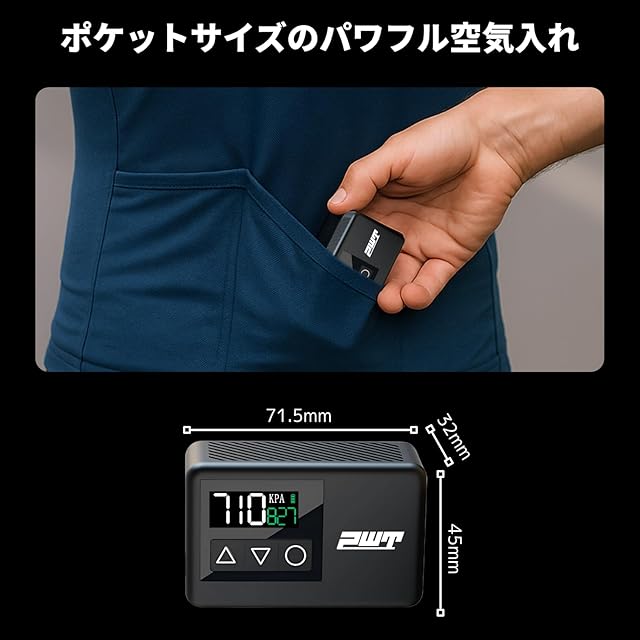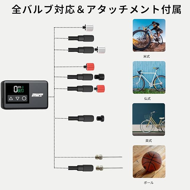 商品名:PWT 電動空気入れ 自転車 空気入れ 日本メーカー 最大120psi /827kPa 全バルブ対応(米式/英式/仏式) 携帯 小型 軽量 コンパクト スマート エアコンプレッサー ボール対応 ロードバイク 車 自動停止機能
