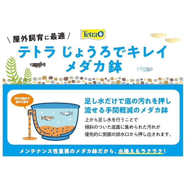 ●斜面状の底面で集めたメダカのフンなどの汚れを、足し水で押し流すことで水をキレイに保ちます。