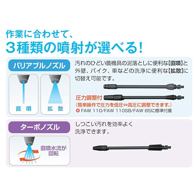 最大吐出圧力:[バリアブルノズル取付時]7.5MPa・[ターボノズル取付時]5.0MPa
