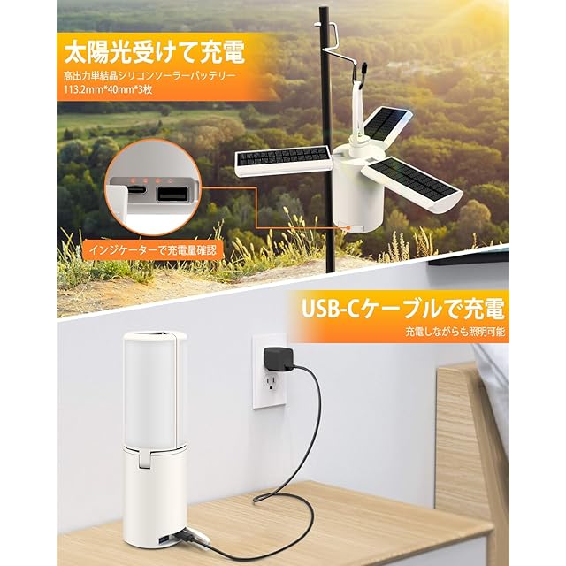 ランタンのLEDライト部分は可動式で、竹とんぼの羽のように開き、フックに吊るすことで広範囲を照らすことができます。また、LEDライトを閉じてキャンドル状にすれば、360度照明が可能になり、どこに置いてもテーブル全体をしっかりと照らせます。そのため、置き場所に困らず、どんなシーンでも便利に使えます。</br></br> さらに、シリコンフックを採用しているため、テーブルに置くだけでなく、ポールや木の枝に吊り下げることも可能です。シンプルで洗練されたデザインは室内のインテリアにも馴染みやすく、家庭での日常使用にも最適です。</br></br> 充電方法は2Way式で、ランタンLED部の裏に3枚のソーラーパネルを搭載。羽を開いて太陽光で充電を開始できます。天気が悪い日や急ぎの場合でも、USBポートでの充電が可能です。</br></br> LED部には乳白色のシェードを採用し、影やムラのない柔らかな光を広げます。室内使用だけでなく、キャンプや登山といったアウトドア、さらには災害時の非常灯としても活躍します。</br></br> 5つのモード(暖色、温白色、昼白色、懐中電灯、フラッシュライトSOS)が選べるため、荷物を減らしたい方にもおすすめの多機能ランタンです:</br></br> 暖色:温かみのあるオレンジ色の光で、キャンプの雰囲気作りに最適。眩しさを抑えた柔らかな光は、テーブルランタンやリラックスタイムのサブランタンとしても活用できます。</br></br> 白色:太陽光に近い自然な明るさで、モノや色をはっきり認識しやすいのが特徴。料理や細かな作業にも最適です。</br></br> 内蔵の8000mAhバッテリーは、ローモード(80lm)で最大85時間、ハイモード(500lm)でも10時間の連続使用が可能です。さらに、ボタンひとつで無段階調光ができ、シーンに合わせて明るさを細かく調節可能。電力消費を抑え、省エネにも繋がります。</br></br> また、IP54の防水性能を備えているため、突然の雨やアウトドアでの使用も安心です。
