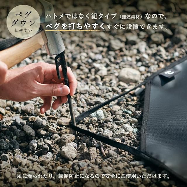 【ペグダウン可能】 四隅にペグダウンすれば地面にしっかりと固定できます。風の強い日でもシートが風で飛ばされる心配がなく、焚き火や調理を安全に楽しむことができます。ハトメではなく紐タイプなので、ペグを打ちやすいというメリットもあります。