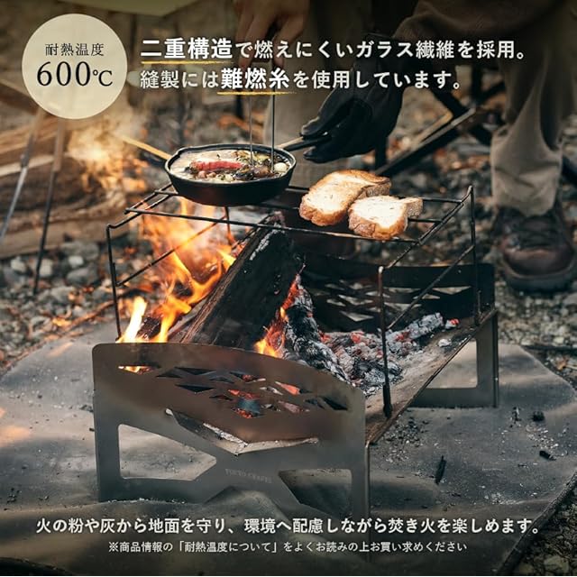 【注意事項】 本製品は耐火・耐熱シートであり、断熱シートではございません。設置場所に伝わる熱を和らげるものであり、熱を完全に遮断するものではなく、延焼を防ぐ道具としてお使いください。地面にある芝生やその他植物に関しましては、40~50度程度の熱でも長時間されらされますと枯れてしまいます。芝生サイトでのご利用の際は焚火シートでの断熱は難しい為、ブロックや断熱効果のある台などを必ず併用ください。