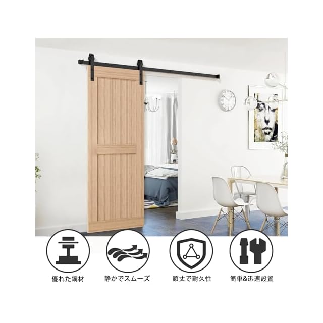 【高い互換性・DIYに最適】 この1.83m吊り引き戸レールセットは、幅87cm以下、厚さ3.5~4.5cmの室内ドアに最適です。簡単DIY設計で、あなた好みのユニークなお部屋スタイルを簡単に実現!※ご注意:引き戸 diy キットのみ販売、ドアは含まれません。使用前に付属品をご確認ください。