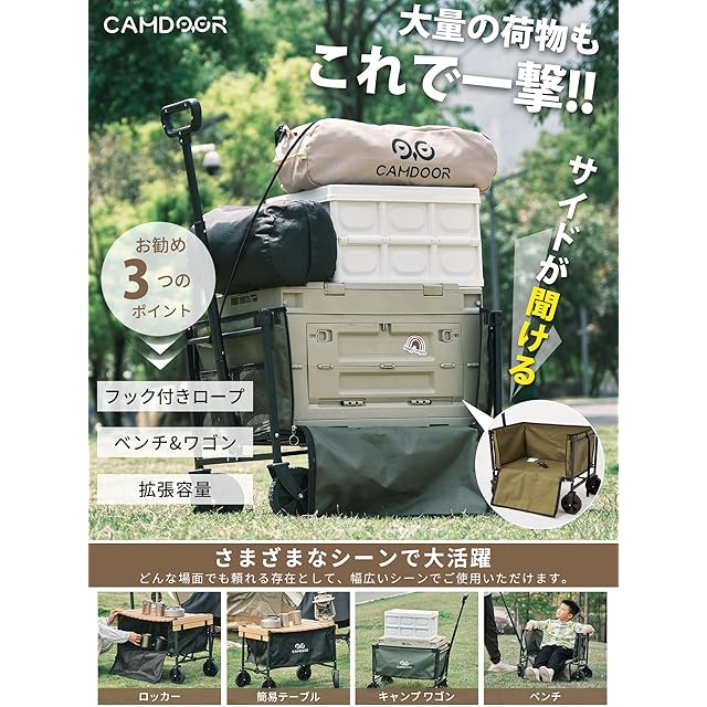 【側面がパカッと開く!】CAMDOOR キャリーカートは、荷物の出し入れが驚くほどラクラク!さらに、ペット用カートとしても大活躍。サイドドアからペットがスムーズに乗り降りでき、どこへ行くにも快適にお出かけできます。荷物がない時には、ベンチとしても使える優れもの。アウトドアシーンにぴったりな「運ぶ・乗せる・座る」の3WAY多機能ワゴンです!