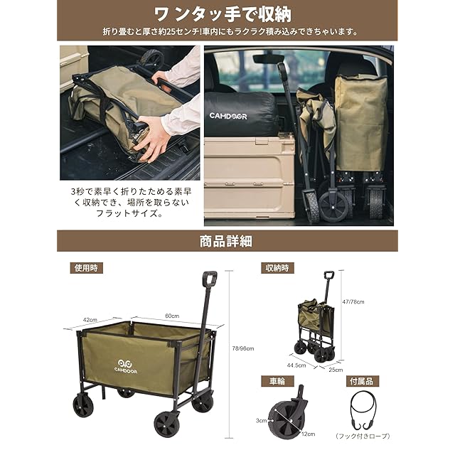 商品名:CAMDOOR サイドが開ける キャリーワゴン【 最軽量設計3.9kg・3秒で簡単収納 】キャリーカート コンパクト 耐荷重65kg 折りたたみ式 最大容量126L 折り畳み アウトドアワゴン キャリーカート キャンプカート 軽量 4輪 タイヤ キャンプ 砂浜 釣り 引越し 買い物