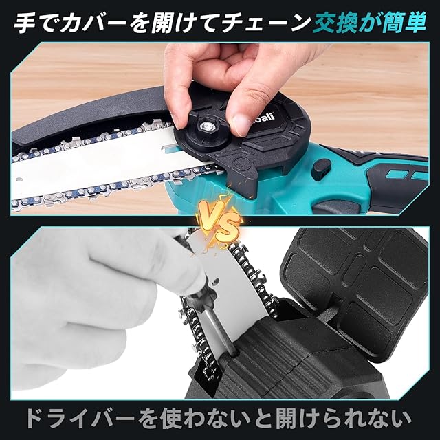 【純銅モーター&耐久性UP】このチェンソーは強力な純銅モーターと深い焼入れた高硬度で耐磨耗性に優れているチェーンを採用して、切断性能を向上させるだけでなく、耐用年数を延ばすことができます。また、この充電式 チェーンソーは、高エネルギー消費と高騒音の問題を解決することに専念し、アップグレードされた製品は、高効率と低消費、安定性と低騒音を備えています。これに加えて、交換可能な6インチのチェーンも用意されています。