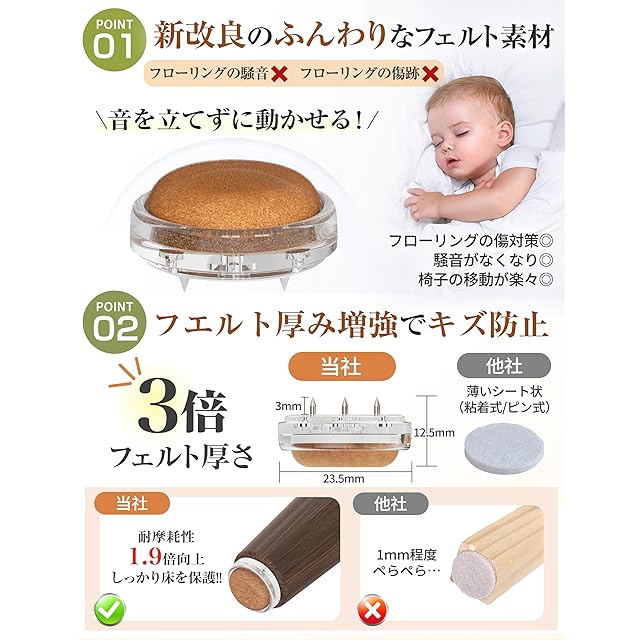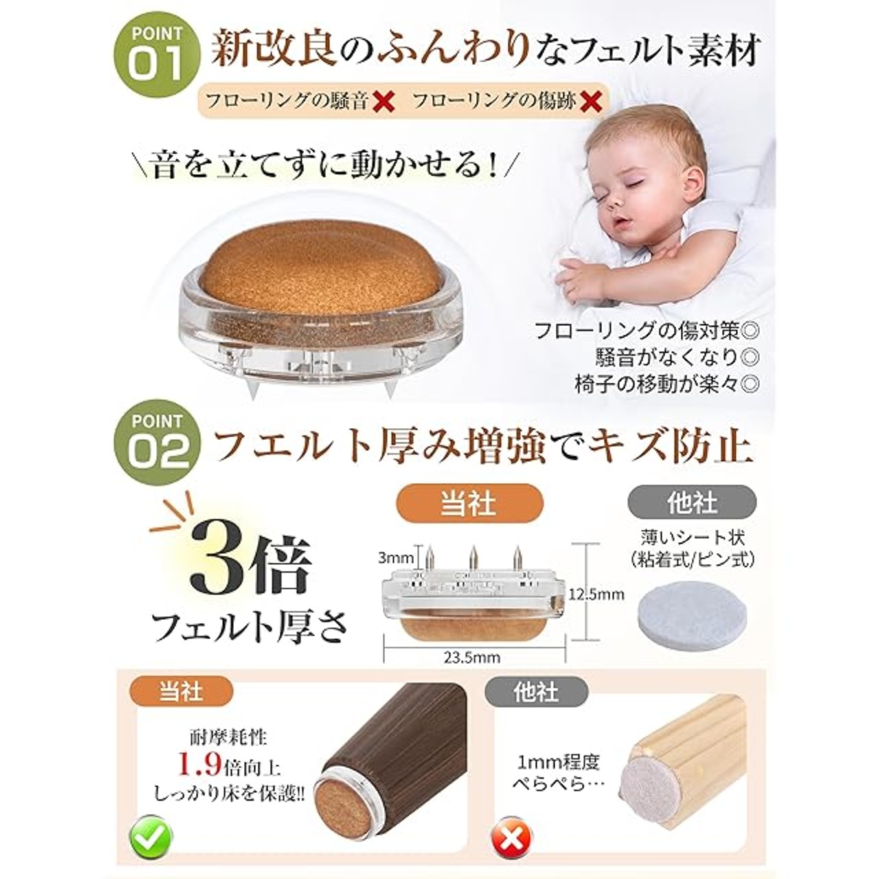 ■【2025新型モデル・キズ防止・椅子脚カバー】<br/>フローリング対応、床を傷つける心配なし!床に接する部分は柔らかいフェルト素材で、床を傷つける心配がありません。<br/>■【新改良の厚手フェルト素材・耐摩耗性1.9倍向上】<br/>従来のゴム製カバーの4.3倍の滑らかさ、1.9倍の耐摩耗性を実現しました。耐久性に優れ、耐摩耗性が高く、長期間の使用でも安心です。<br/>■【騷音防止・音を立てずに動かせる】<br/>3倍の厚さのフェルトでしっかり床を保護!滑らかな表面加工により椅子脚の摩耗を抑え、フローリングでもスムーズに移動できます。<br/>■【外れにくく・ズレにくい】<br/>「3つのアンカー(約3mmの突起)」と「超強力テープ」を採用し、椅子脚にしっかりと食いつき、外れにくい特別な設計です。通常の両面テープのみで取り付けた場合と比べ、4倍の強度でしっかり接着。<br/>■【定期的なお掃除でキズ防止】<br/>砂や異物が突き刺さり、床を傷つける原因に、乾いた布巾やガムテープや粘着テープでゴミを取るだけ!!<br/>■【様々な形状の脚に対応】<br/>四角型、丸型、長方形、さらには前後異なる形状の椅子脚にもぴったりフィット。<br/>■【サイズ選び不要】<br/>コインサイズ以上の木製椅子脚であれば、形状に関係なく取り付け可能です。面倒な採寸作業は不要で、異なる形状の椅子にも対応します。<br/>■【広い適応範囲】<br/>ご家庭での使用はもちろん、会議室や学校、図書館、カフェ、飲食店、食堂、待合室など、多様な場面で活用できます。子供がお昼寝している時など、ちょっとした雑音が気になる場合にも最適です。