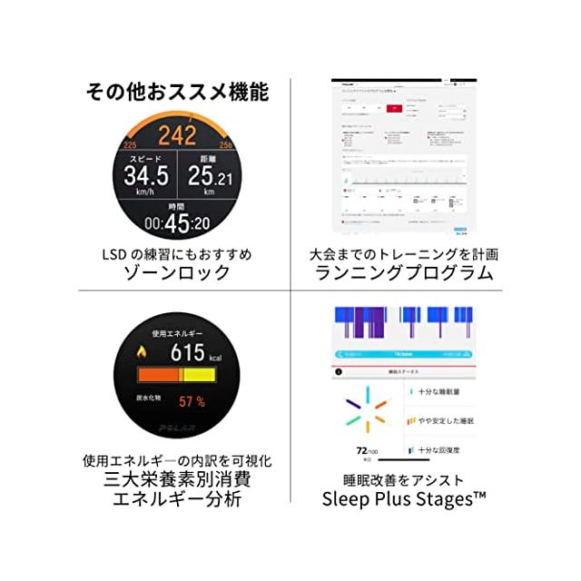 主な機能:手首型心拍計測、GPS(みちびき対応)、オート/マニュアル ラップ計測、ランニング/ウォーキングテスト、三大栄養素別で消費エネルギーを表示、栄養補給リマインダー、活動量計測(歩数・距離・消費カロリー等)、睡眠・自律神経計測、スマート通知(着信・通知)、音楽コントロール、天気予報、 耐水50WR
