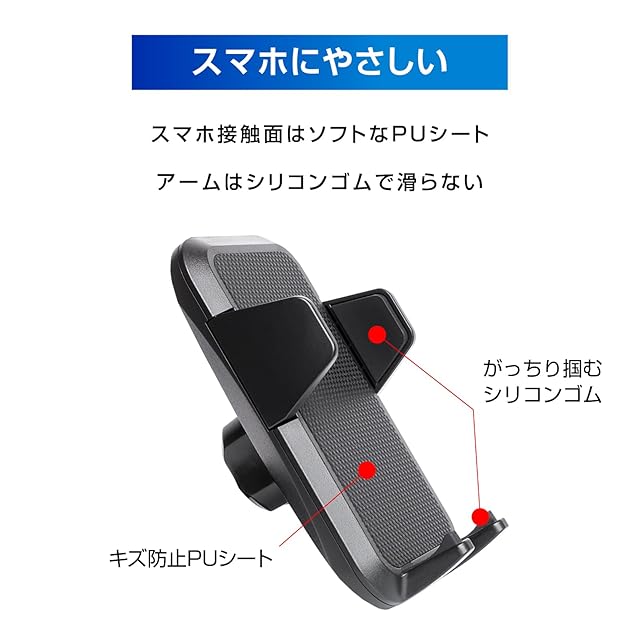 【スマホ固定】●スマホを固定するサイドアームは手帳型やリング付きの厚みにも対応。グリップの良いシリコンゴムでがっちり固定します。●片手で簡単。ホールド&リリース。スムーズなギアが品質の証。