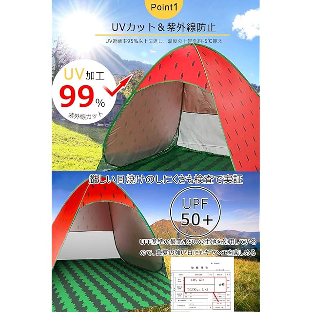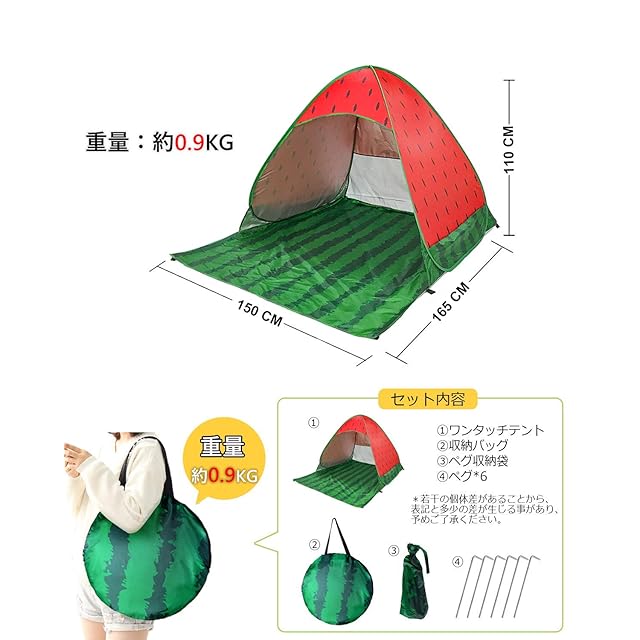商品名:ポップアップテント ワンタッチテント 簡易テント ワンタッチ ビーチテント 1人用 サンシェードテント 2-3人用 軽量 屋内 用 テント 運動会 テント 防水 通気性 キャンプ用品 ビーチ・キャンプ・海水浴・防災・アウトドアに最適 日本語説明書付き キャリーバッグ付き(西瓜 模様)