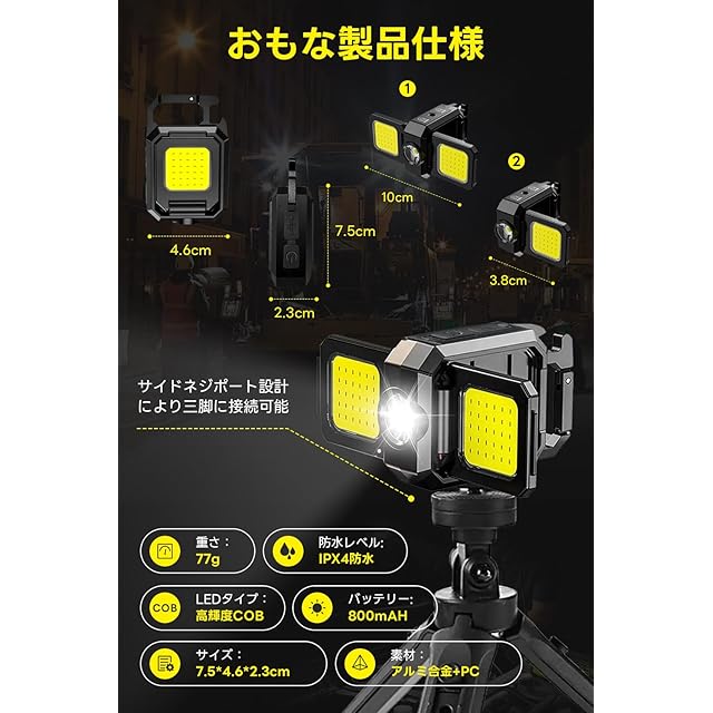 【 折り畳み式· 3つの光源】COBライトは折りたたみデザインを採用しており、使用状況に応じて両側の発光面を0〜90°まで調整できます。3つの光源が搭載されていて、とても明るいです。作業用や非常用にも活躍します。