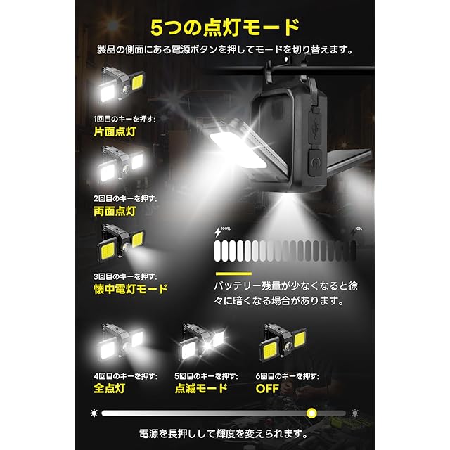 【5つの点灯モード】製品の側面にある電源ボタンを押してモードを切り替えます。1回目のキーを押す:片面点灯、2回目のキーを押す:両面点灯、3回目のキーを押す:懐中電灯モード、4回目のキーを押す:全点灯、5回目のキーを押す:点滅モード、6回目のキーを押す:OFF。電源を長押しして輝度を変えられます。ご注意:バッテリー残量が少なくなると徐々に暗くなる場合があります。