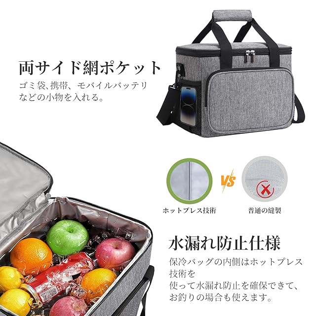 【30L大満足な容量】クーラーボックスク のサイズ:35x28x28cm、重量:約0.74kg、最大30Lの大容量を提供されます。【メインポケット】6本の2Lのペットボトルが横に入り、缶330mIジュースなら40本入る大容量の クーラーバッグ で、かも角型で蓋も大きく開くので、飲み物や食材お弁当も傾けずにまっすぐ入れやすいです。【フロントポケット】 ソフトクーラーボックス のフロントに大きめのファスナーポケットを設置しているため、食材以外にも財布、鍵、ナプキン、カトラリーや食器など、身の回りの小物を収納できます。【両サイド網ポケット】両サイドの網ポケットには携帯、モバイルバッテリー、ゴミ袋なども収納でき、出掛ける時必要な物が1つの 保冷バッグ に収まります。そして食べ物や飲みものをこぼしてもきれいに拭き取れる生地を採用しており、お手入れも簡単です。