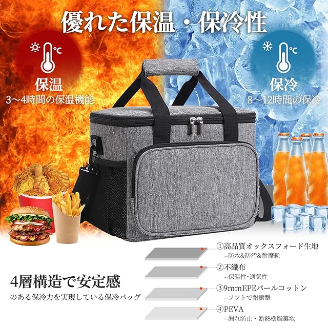 【4層構造によって長時間保温·保冷】 ソフトクーラー は4層構造になっています。外層は600D超厚手のオックスフォード素材で作られており、防水に優れ、耐摩耗性があり、摩耗や引き裂き、色あせしにくいです。第二層は高品質不織布環境にやさしい、第三層9MM極厚EPE材質、保温性、 保冷性、 断熱性が優れた 。第四層抗菌PEVA裏地、内部のアルミ箔インターフェースはホットプレスプロセスを採用しており密閉性がアップ!アウトドアに欠かせないアイテムとして、その保冷力と耐久性は最も重要です。外気の熱が中に入り込みにくく長時間に渡って低温を維持でき、保温・保冷に最適な保冷機能付きランチバッグです。3~4時間保温、8~12時間保冷できます。(ご注意:アイスバッグと保冷剤を合わせて使用して、保冷力もっとよい)